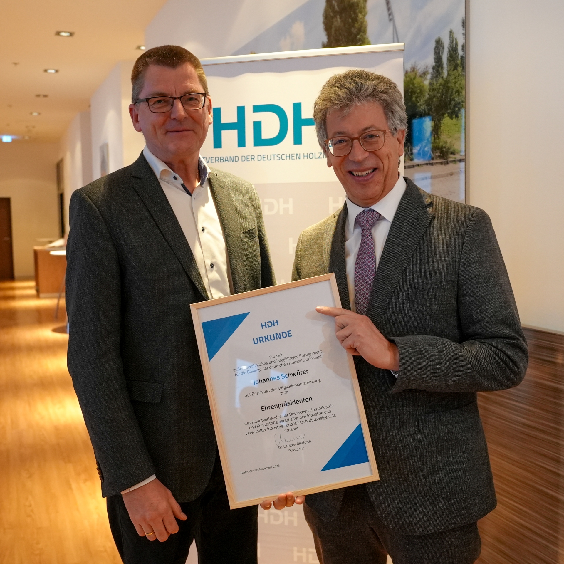 Dr. Carsten Merforth wurde auf der Mitgliederversammlung des Hauptverbandes der Deutschen Holzindustrie und Kunststoffe verarbeitenden Industrie (HDH) in Berlin zum neuen Präsidenten des Verbands gewählt. Der bisherige Präsident Johannes Schwörer trat nach 17 Jahren an der Spitze von seinem Amt zurück. In Anerkennung für Schwörers Verdienste um die Holz- und Kunststoffe verarbeitenden Industrie wählten ihn die Mitglieder anschließend zum Ehrenpräsidenten. Zum neuen Vizepräsidenten wurde Dr. Jan Bergmann gewählt.