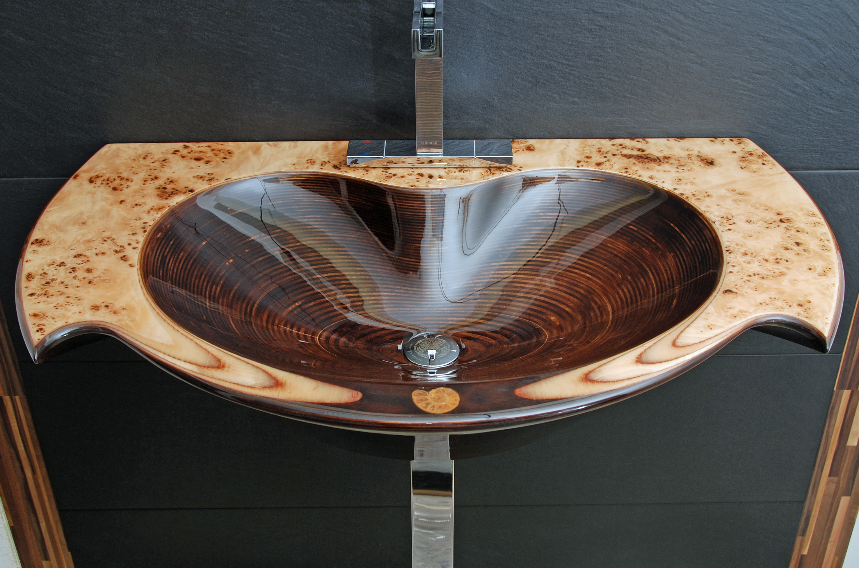Bild 1: Hingucker für die Messe: Ein Waschbecken dieser Art wird auf dem Stand der IFN gezeigt. Foto: MAC HOLZWASCHBECKEN