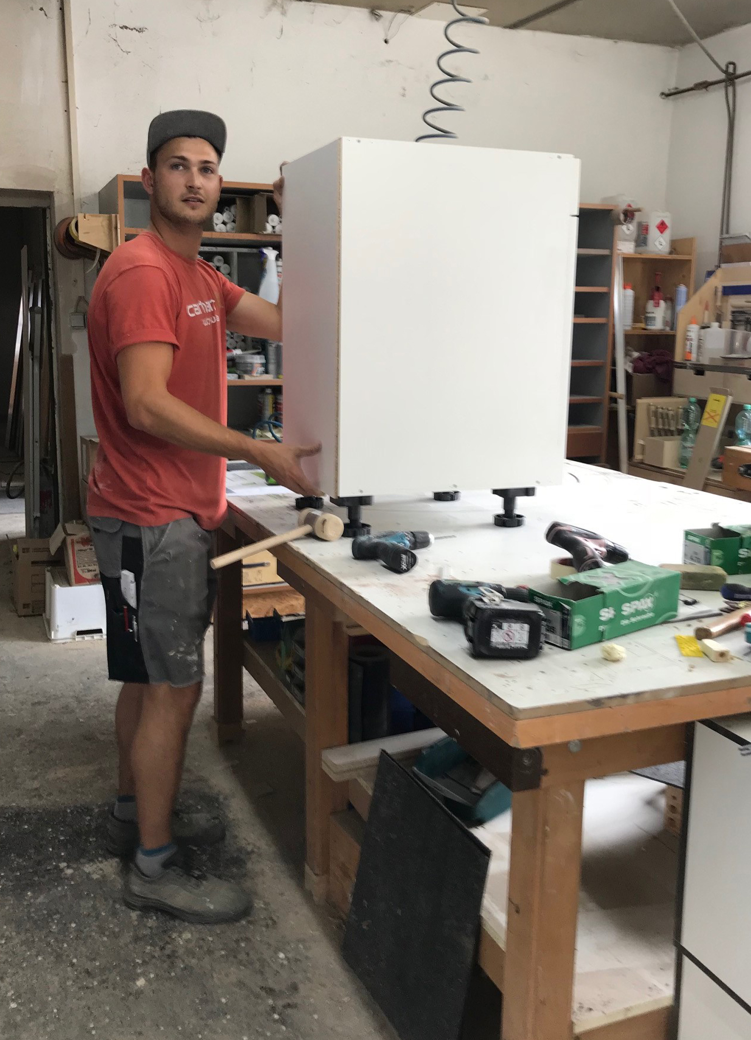 Bild 3: Der frischgebackene Geselle Tim Gocke montiert eine selbst hergestellte Küchenzeile in der Lehrwerkstatt bei der Firma OKEL. Foto: BIEF/Okel