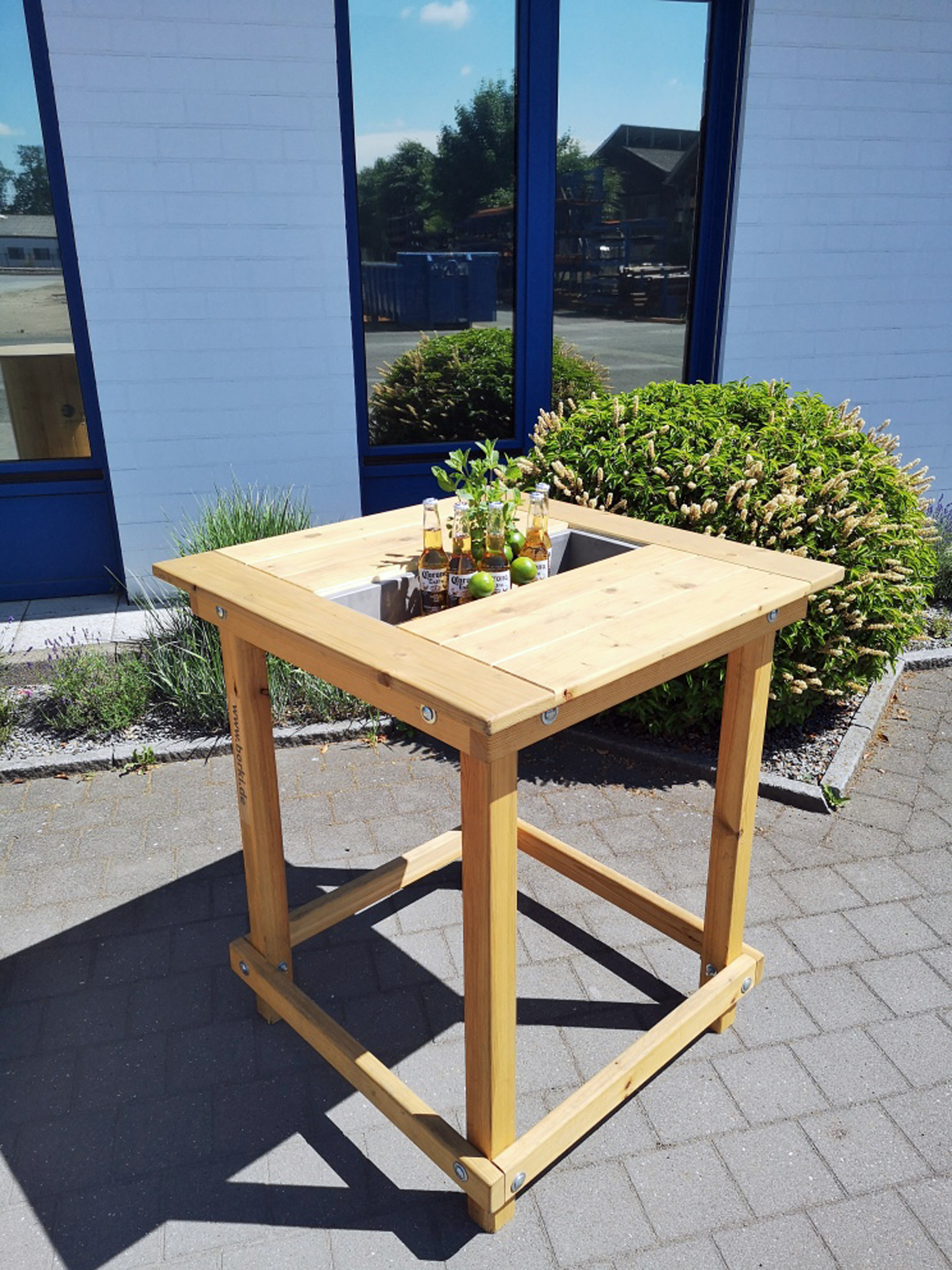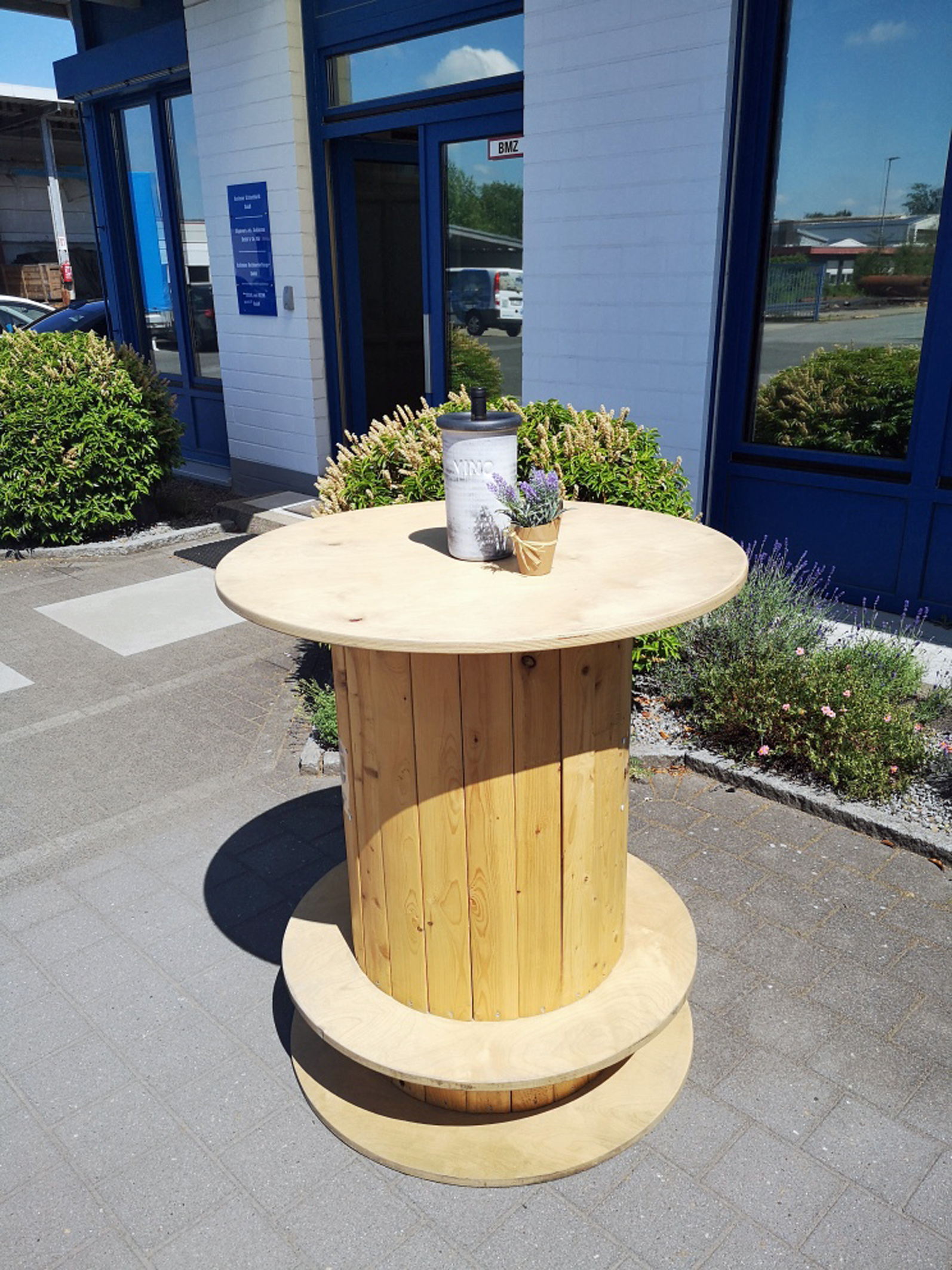 Bild 3: Stehtisch aus einer Kabeltrommel. Foto: HPE/Borkener Kistenfabrik