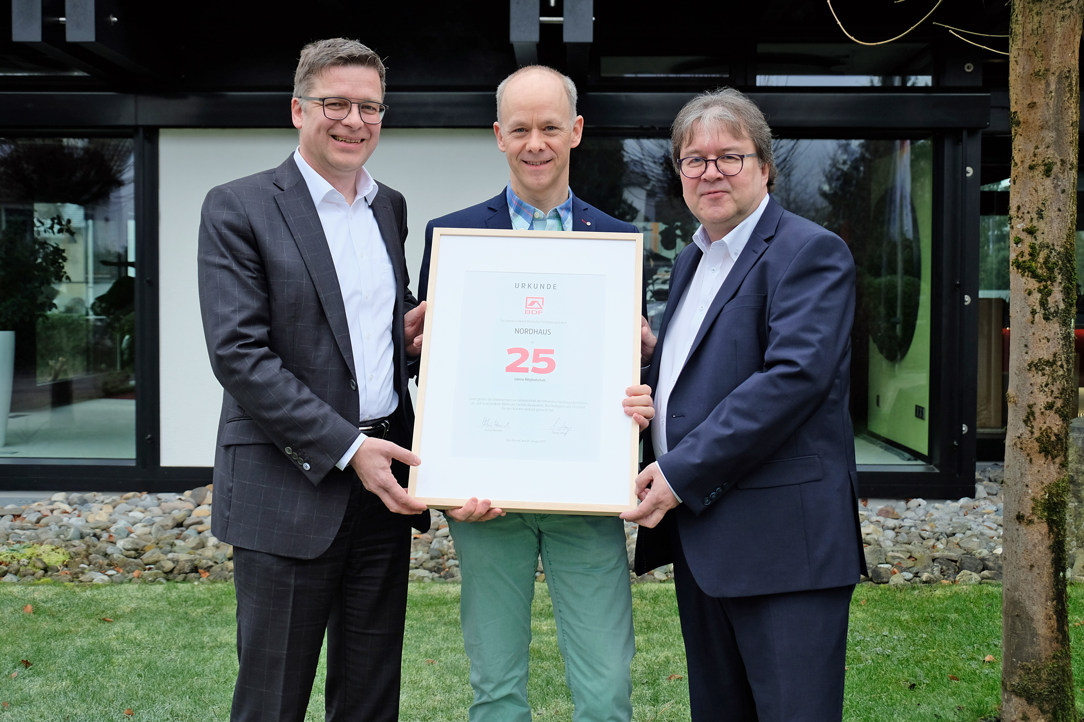 23.01.2020Bad Honnef/Kürten. Der Fertighaushersteller Nordhaus ist seit 25 Jahren Mitglied im Bundesverband Deutscher Fertigbau (BDF). Die BDF-Geschäftsführer Achim Hannott und Georg Lange überreichten Nordhaus-Geschäftsführer Christoph Brochhaus die Jubiläumsurkunde und dankten für die gute und vertrauensvolle Zusammenarbeit: „Nordhaus ist ein familiär geführtes Vorzeigeunternehmen unserer mittelständisch geprägten Branche, das von vielen zufriedenen Bauherren für seine Qualität und Kundennähe geschätzt wird. Wir freuen uns sehr über das große Engagement, das Nordhaus bereits seit einem viertel Jahrhundert in unsere Verbandsarbeit einbringt.“
