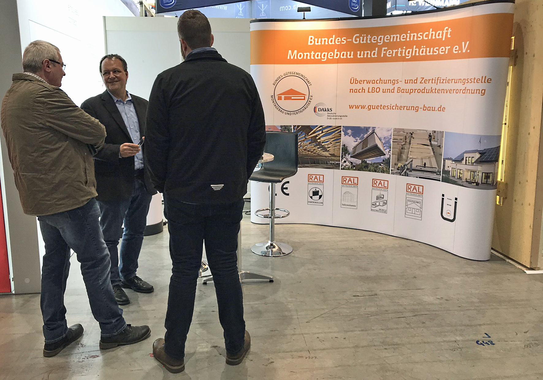 Gütegemeinschaft verstärkt Messepräsenz31.01.2020Bad Honnef. Die Bundes-Gütegemeinschaft Montagebau und Fertighäuser (BMF) war in diesem Jahr erstmals auf der Dach+Holz International, die vom 28. bis 31. Januar 2020 in Stuttgart stattfand, mit einem eigenen Messestand vertreten. „Neben dem Internationalen Holzbauforum in Innsbruck (IHF) und dem Kongress Effizientes Bauen mit Holz im urbanen Raum (EBH) in Köln haben wir uns entschlossen, nun auch in Stuttgart Präsenz zu zeigen, um über Themen wie Gütesicherung und Überwachung zu informieren und den Kontakt zu unseren Mitgliedern zu suchen“, erklärt Florian Bauer, Geschäftsführer der BMF.