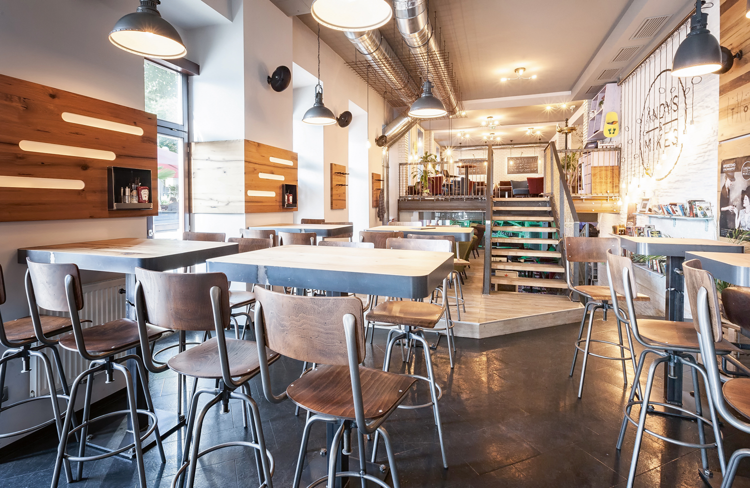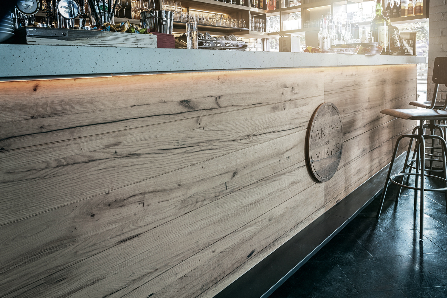Bei der Renovierung fiel die Wahl auf Eichen-Altholz-Furnier der Firma Kaindl aus Österreich. „Die natürlich dunklere Holzfarbe der Eiche sowie der Naturmix aus Fries- und Fladerfurnier verbinden sich perfekt zu dem angestrebten Ambiente aus Industrial und Vintage“, folgert Geismann und schließt „Die Holzakzente lassen eine charmante Atmosphäre entstehen, in der man mit einem leckeren Getränk den Tag gemütlich ausklingen lassen kann.“ IFN/MG