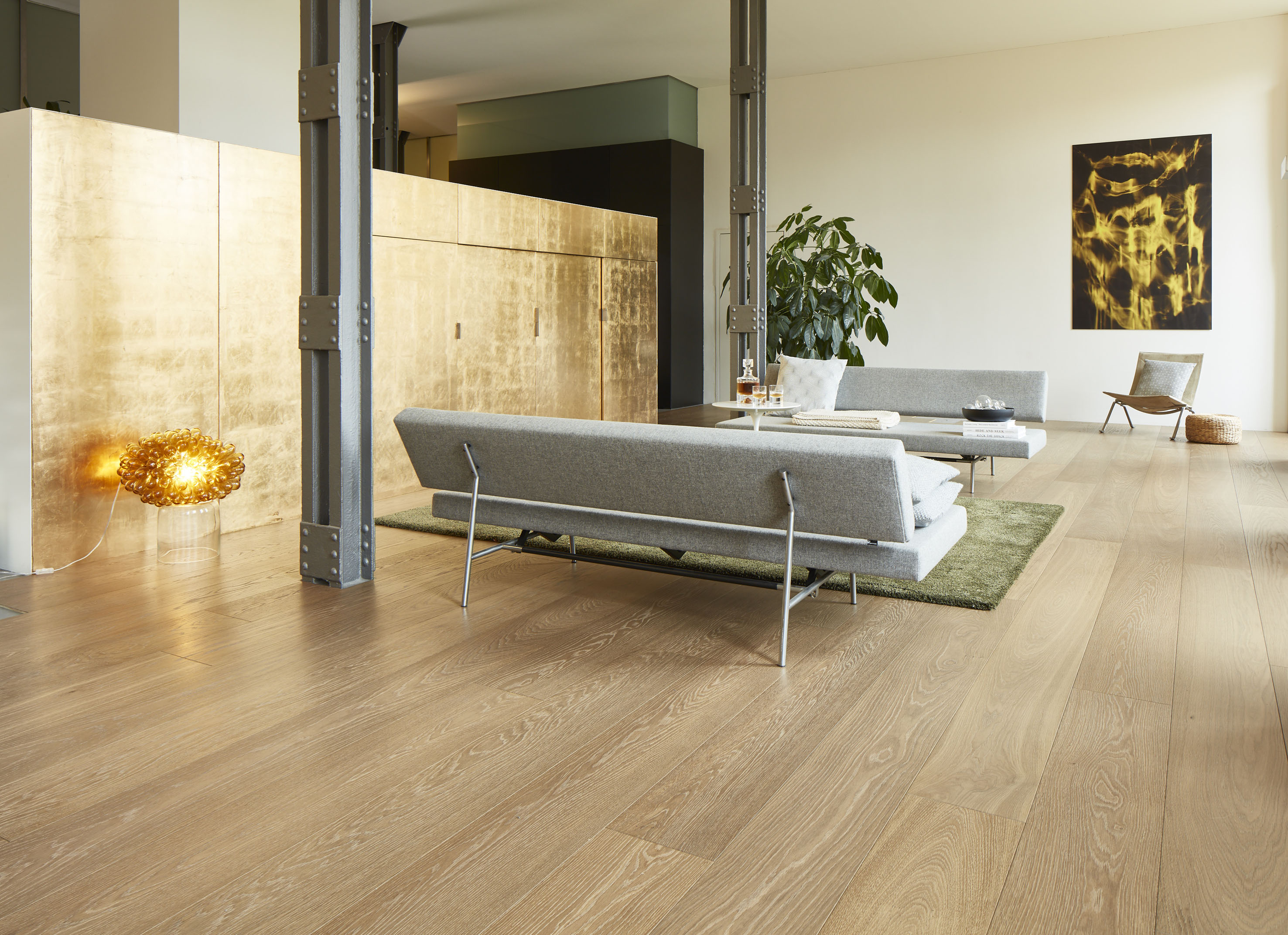 Für welches Holz man sich entscheidet, hängt dabei auch davon ab, ob das Haus oder die Wohnung mit einer Fußbodenheizung ausgestattet ist. Generell können viele Holzarten eines Parkettbodens damit kombiniert werden, aber neben einigen tropischen Hölzern aus kontrolliertem Anbau wie Merbau oder Doussie eignen sich besonders heimische Hölzer wie Eiche, Kirsche und der Nussbaum. Denn: „Holz zieht sich abhängig von der Raumtemperatur und Luftfeuchtigkeit zusammen oder es dehnt sich aus, und diese Eigenschaften gilt es zu beachten“, weiß Schmid. „Auch ist es wichtig, das Parkett in diesem Fall vollflächig zu verkleben. Auf diese Weise wird die Bildung einer isolierenden Luftschicht unter dem Holz verhindert.“ Beachtet man dies, wird man spätestens im ersten Winter die Vorzüge eines gewärmten Holzfußbodens genießen können.