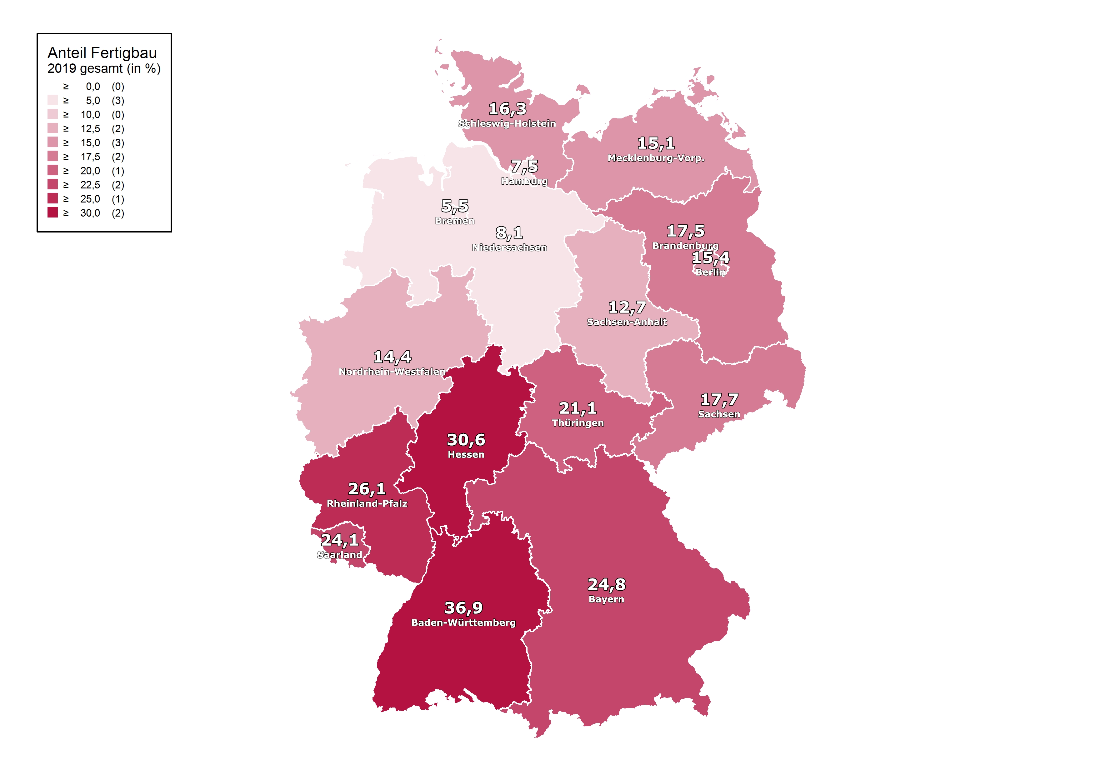 Im Vergleich der Bundesländer stechen Baden-Württemberg und Hessen mit Fertigbauquoten von 36,9 bzw. 30,6 Prozent besonders positiv heraus. Mit Blick auf die absoluten Stückzahlen belegt Bayern mit 5.644 neu genehmigten Fertighäusern in 2019 (24,8 Prozent Marktanteil) die Spitzenplatzierung. Traditionell besitzt der Fertigbau in Süddeutschland eine stärkere Marktposition als im Norden, dennoch hat er sich bundesweit in elf Ländern besser entwickelt als der Gesamtmarkt.