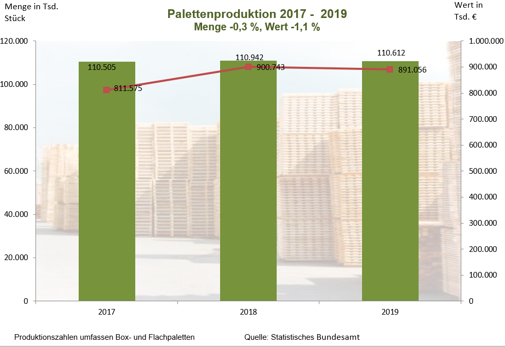 Laut Statistischem Bundesamt hat die Palettenproduktion nach der Steigerung 2017 auf 110 Millionen das Allzeithoch im Jahr 2018 mit 111 Millionen produzierten Stück nur knapp verfehlt: 110,6 Mio. Paletten „Made in Germany“ wurden 2019 hierzulande hergestellt. Ein minimaler Rückgang um 0,3 Prozent. Allerdings fiel der Produktionswert mit 1,1 Prozent überproportional. Zudem schrumpfte der um den Außenhandel bereinigte Gesamt-Palettenmarkt in Deutschland um 2,1 Prozent auf insgesamt 143,6 Mio. Paletten.