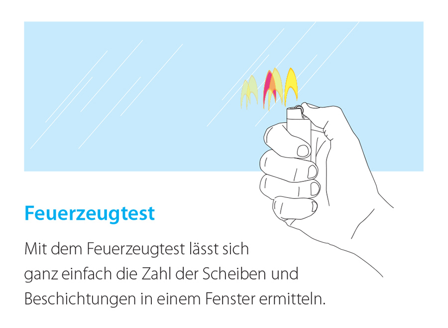 Halten Sie ein Feuerzeug oder eine Kerze von innen dicht an die Fensterscheibe und achten Sie auf die Spiegelbilder der Flamme. Anzahl und Farbe dieser Spiegelbilder verraten die Art der verbauten Fenster. Dabei erzeugt jede Glasscheibe zwei Spiegelbilder. Darum sehen Sie bei einer Scheibe zwei Spiegelbilder, bei zwei Scheiben vier Spiegelbilder, bei drei Scheiben sechs.
