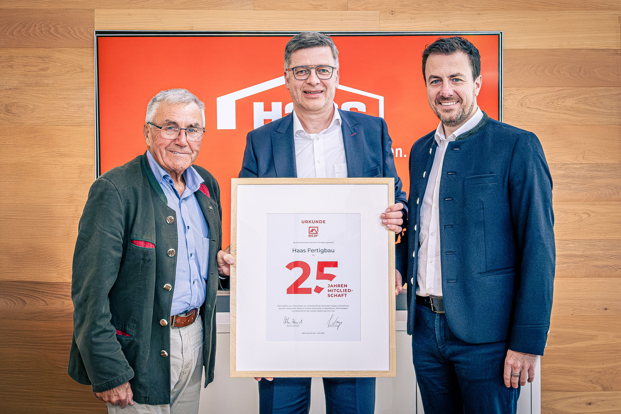 Bad Honnef/Falkenberg. Haas Fertigbau ist seit 25 Jahren Mitglied im Bundesverband Deutscher Fertigbau (BDF). Verbandsgeschäftsführer Georg Lange überreichte Firmenchef Xaver Haas sowie dem Firmengründer Xaver Haas sen. aus diesem Anlass jetzt eine Jubiläumsurkunde und lobte den niederbayerischen Haushersteller: „Seit der Firmengründung im Jahr 1972 hat Haas Fertigbau einen beeindruckenden Aufstieg von einer Zimmerei zum Qualitätshersteller von Wohn- und Objektbauten in zukunftsweisender Holz-Tafelbauweise hingelegt. Als BDF-Mitglied bekennt sich das Unternehmen dabei seit dem Jahr 2000 auch zu den hohen Standards unserer Qualitätsgemeinschaft Deutscher Fertigbau“, so Lange.