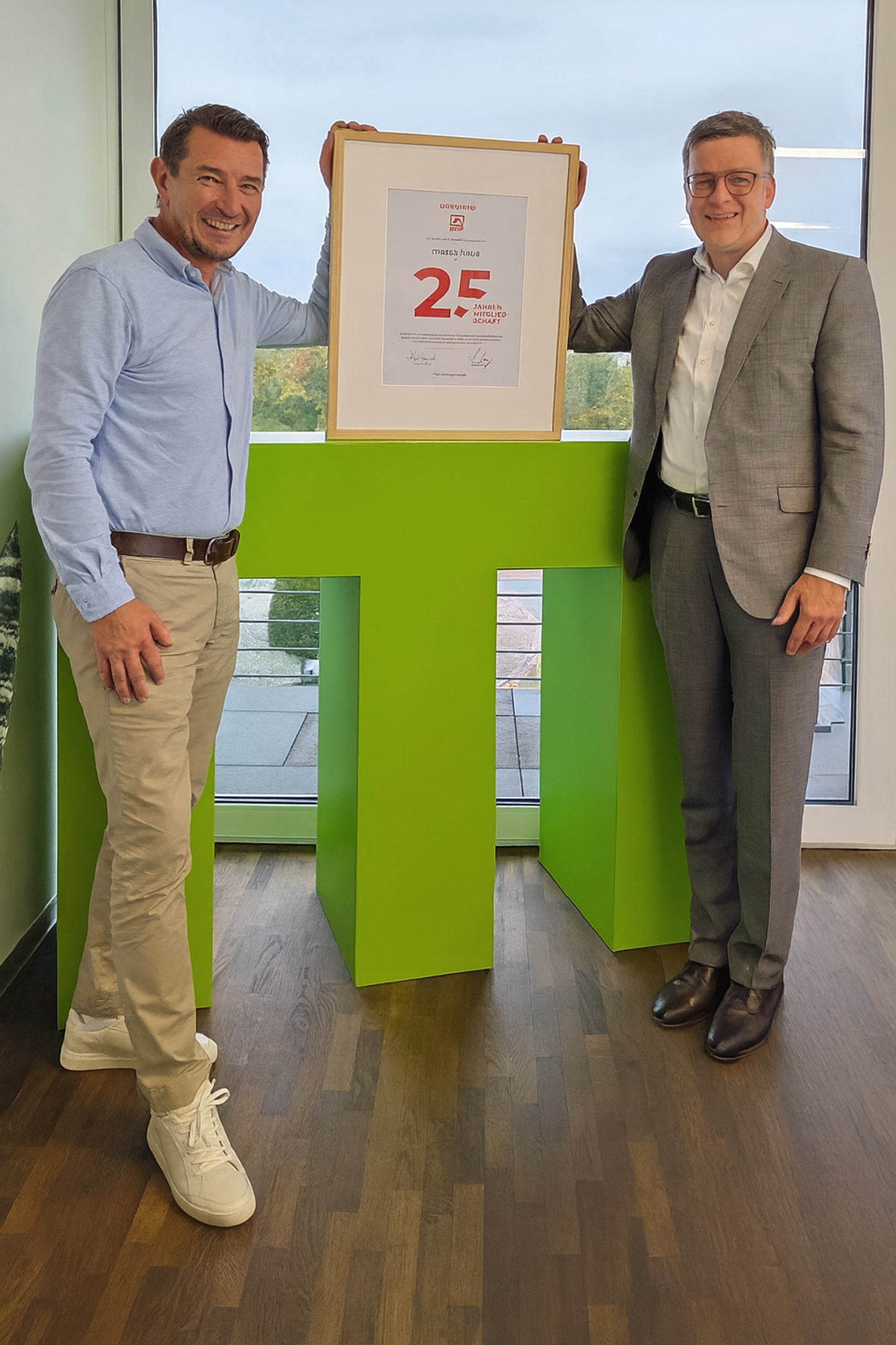 Bild: BDF-Geschäftsführer Georg Lange (r.) überreichte jetzt eine Jubiläumsurkunde an massa-Geschäftsführer Sascha Zimmermann (l.). Foto: BDF/massa haus