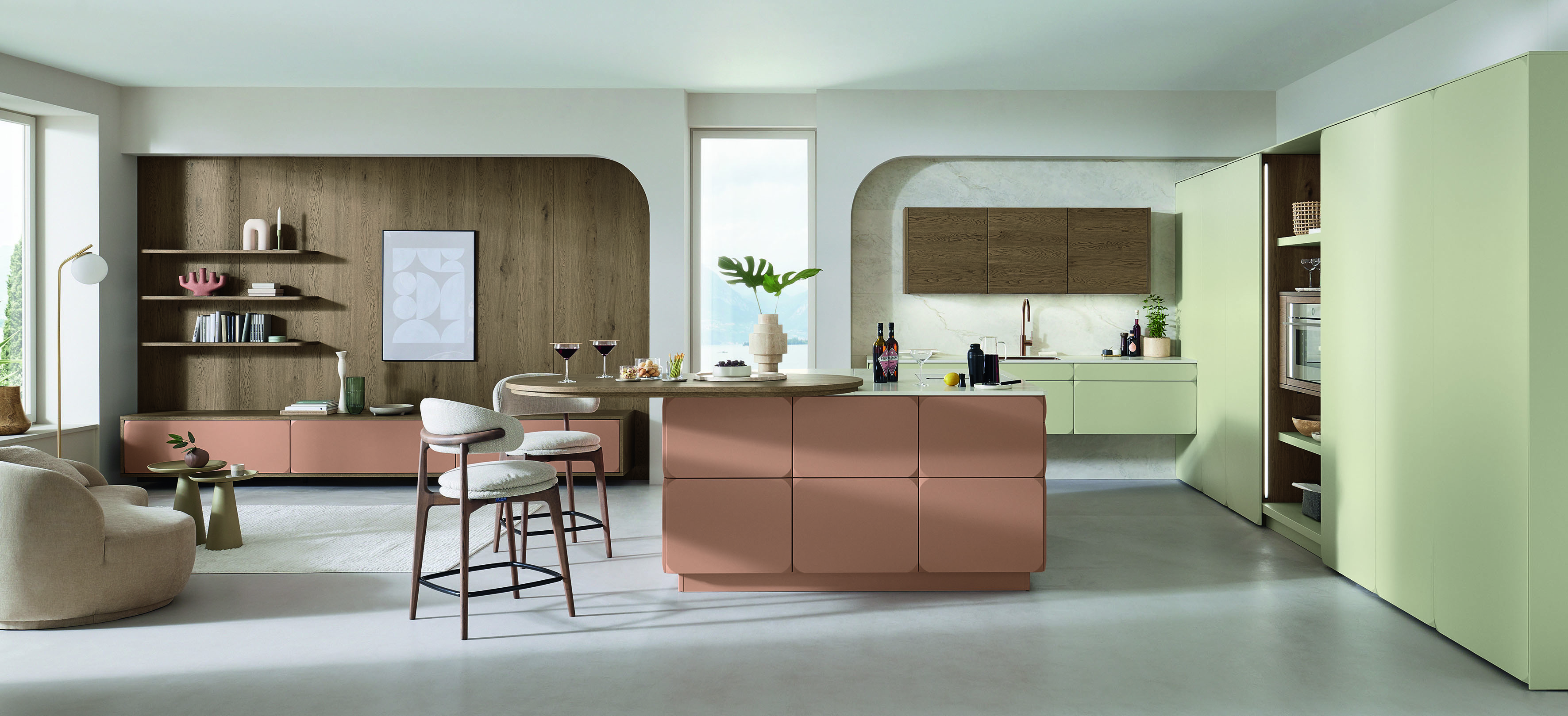 Auch in der Küche herrschen warme Naturtöne wie Beige und Braun in verschiedenen Varianten wie Sand, Macchiato oder Taupe vor. Besonders harmonisch wirkt auch hier ein Ton-in-Ton-Konzept mit einer einheitlichen Erdfarbe für Fronten, Arbeitsplatte, Nischenverkleidung und Griffmulden. Häufig werden die Naturtöne auch mit einem hellen Holz kombiniert.