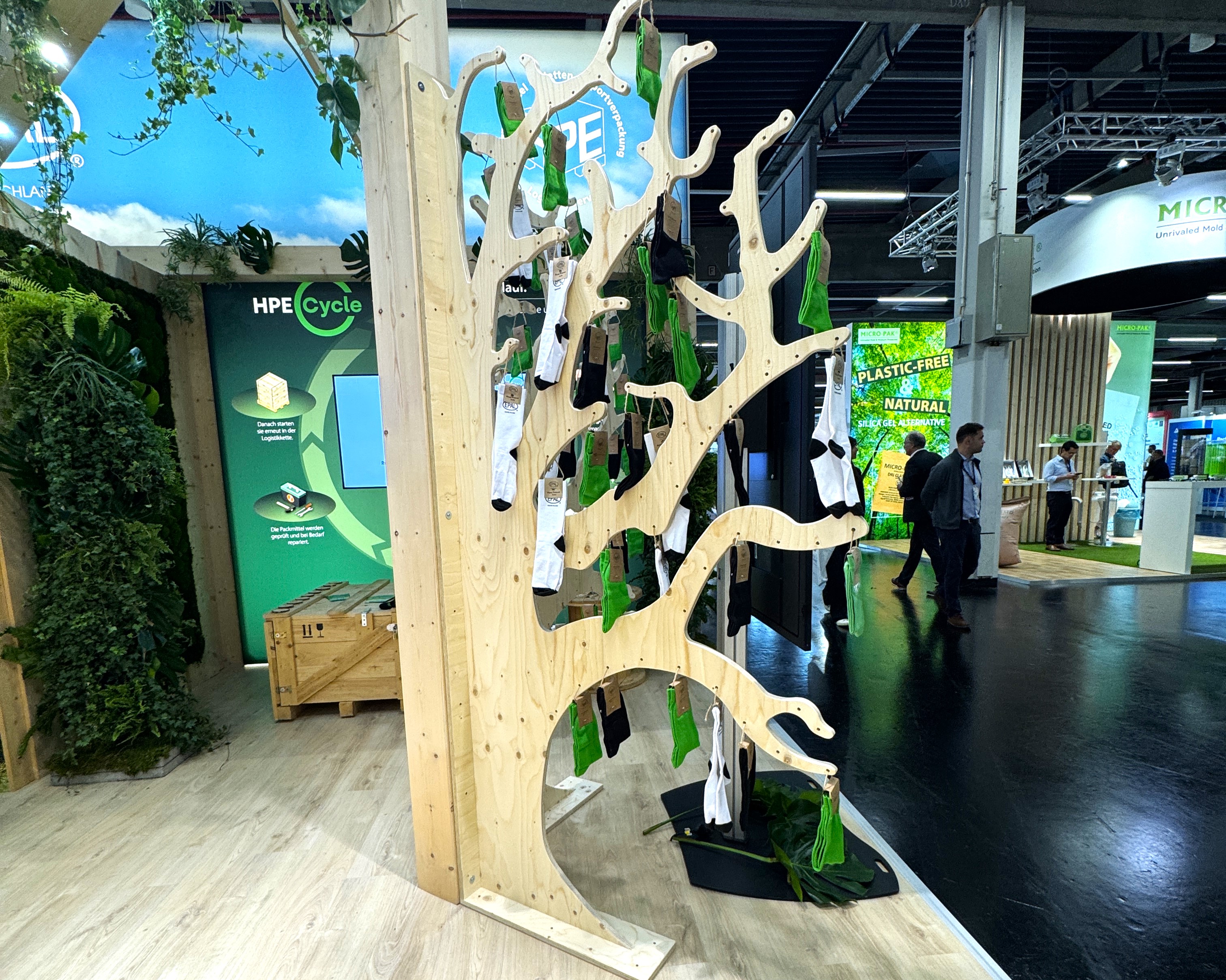 Bild 3:Ein „Sockenbaum“ symbolisierte auf humorvolle Weise die Aufbruchstimmung in der Holzpackmittelbranche hin zur Kreislaufwirtschaft. CR: HPE