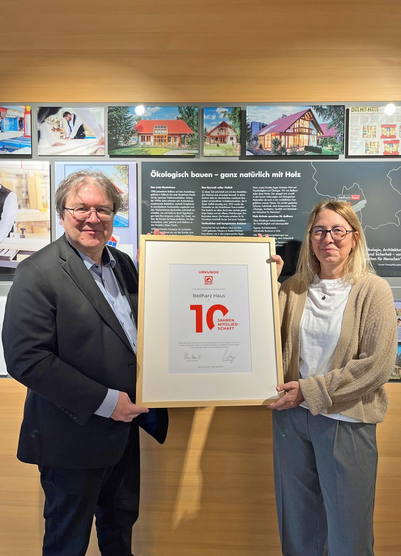 Bad Honnef/Vöhringen. Der Haushersteller Beilharz Haus aus Vöhringen im Landkreis Rottweil ist seit zehn Jahren Mitglied im Bundesverband Deutscher Fertigbau (BDF). Aus diesem Anlass überreichte BDF-Geschäftsführer Achim Hannott der Firmenchefin Daniela Schweizer jetzt eine Urkunde und lobte Beilharz Haus als Familienunternehmen mit Leib und Seele. „Dass sich immer mehr Bauherren für die Holz-Fertigbauweise entscheiden, hängt unmittelbar mit Hausherstellern wie der Firma Beilharz zusammen, die sich für Bauqualität und Nachhaltigkeit sowie kundenindividuell passende Lösungen und vertrauensvolle Zusammenarbeit einsetzen“, so Hannott. Als BDF-Mitglied erfüllt Beilharz Haus seit nunmehr zehn Jahren auch die Standards der Qualitätsgemeinschaft Deutscher Fertigbau, die Bauherren umfassende Sicherheitsversprechen geben.