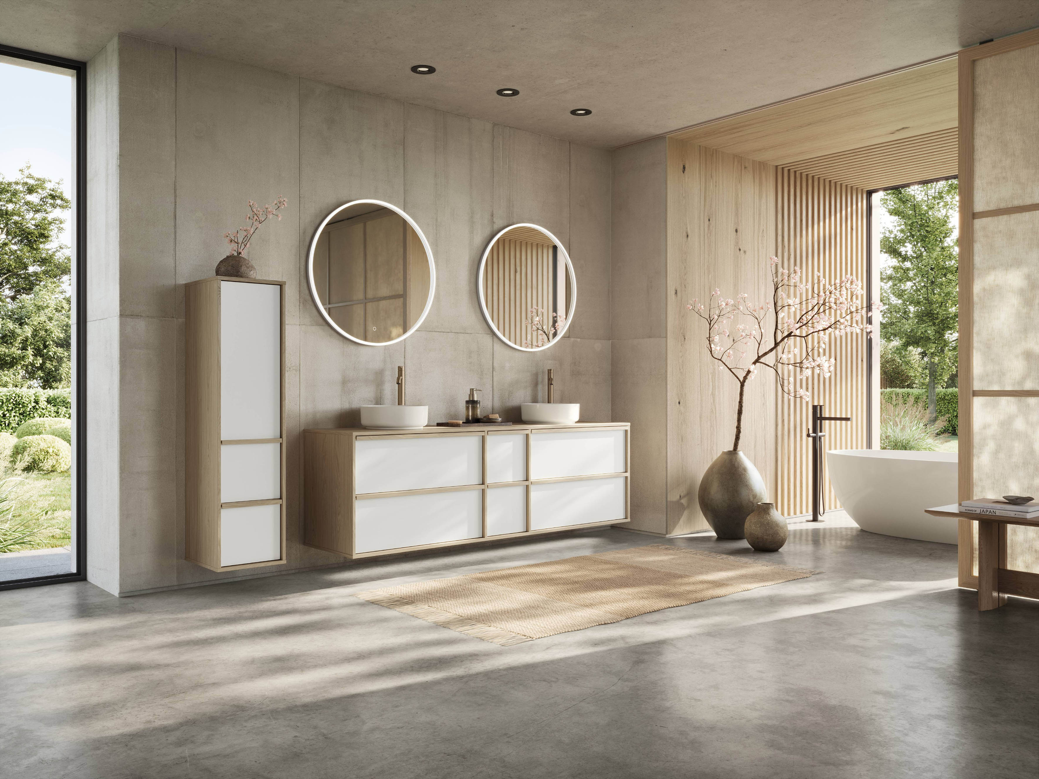 Der angesagte Japandi-Stil hält auch im Bad verstärkt Einzug. Zierliche Rahmenfronten, Naturmaterialien und warme Töne erzeugen eine ruhige Atmosphäre. Dem Wunsch nach immer mehr Wohnlichkeit folgend wird im Badezimmer stark auf Holz gesetzt – in massiver Form, als Furnier oder als Dekor. Als besondere Hingucker eignen sich Holzpaneele. Raffiniert sind Design-Details wie eine aufgedoppelte Frontblende auf dem Waschtisch oder ein weißer Korpus mit schmalem Kantenprofil, der die leicht zurückgesetzte Schrankfront wie gerahmt erscheinen lässt.