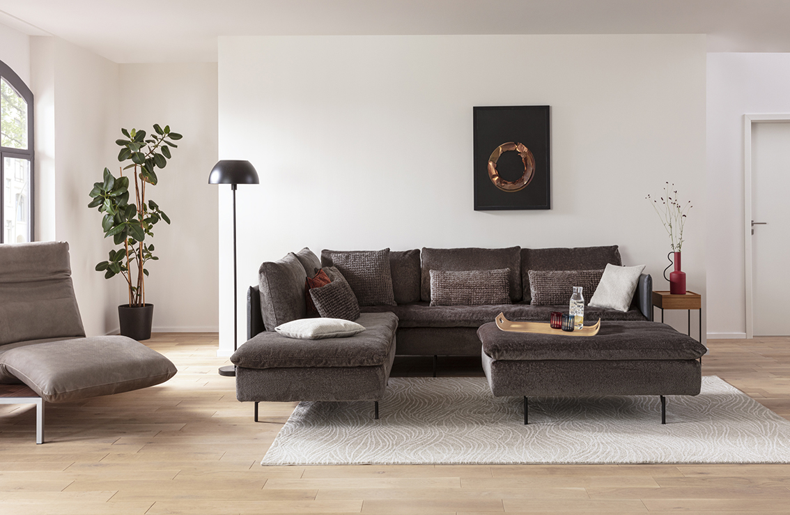 Bei Sofas und Sesseln sorgen besonders softe und in der Haptik weiche Stoffe wie Chenille, Bouclé und Velours für ein behagliches Ambiente. Zunehmend Verwendung finden Materialien mit Anteilen aus recycelter Wolle oder recycelten Kunststoffen. Die Stoffe kommen in natürlichen Tönen daher: Beige, Sand und Grau dominieren, ergänzt durch frische Grüntöne wie Salbei oder Olive sowie warme Erdfarben wie Terrakotta und Rost. Auch die Formen folgen mit zunehmend weichen Linien dem Wunsch nach Natürlichkeit. Die Polstermöbel werden runder, organischer.