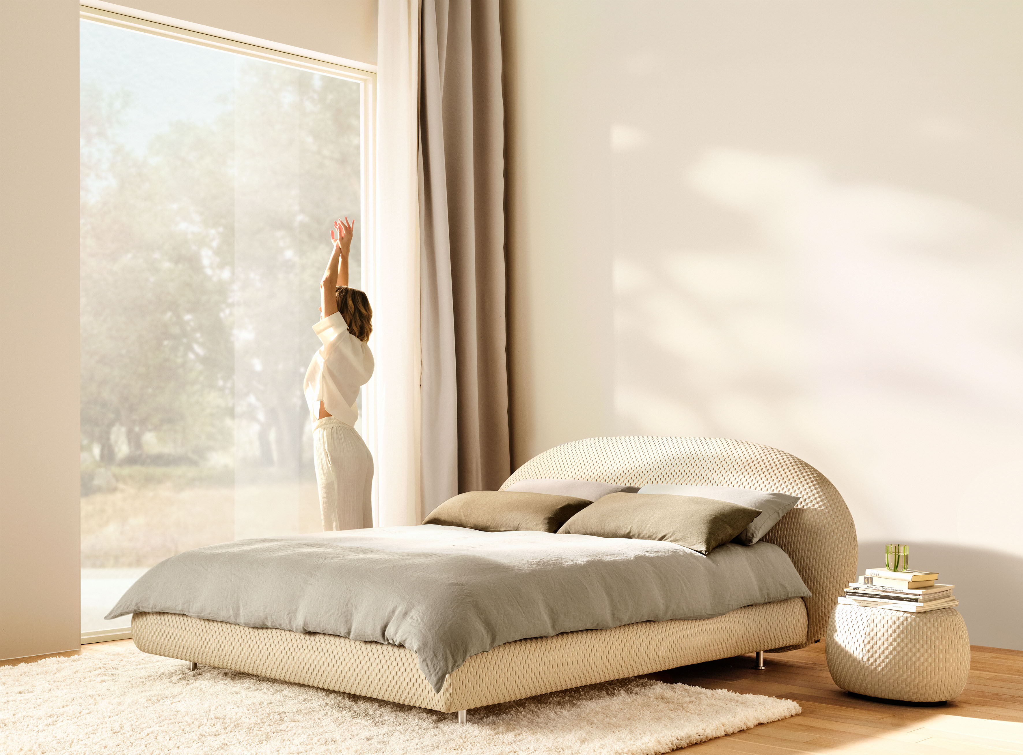 Bild 7: Die organischen Rundungen des gepolsterten Kopfteils vermitteln Behaglichkeit. Durch den Schwebeeffekt der nach innen gerückten Füße erhält das Bett eine außergewöhnliche Leichtigkeit. Foto: Schramm