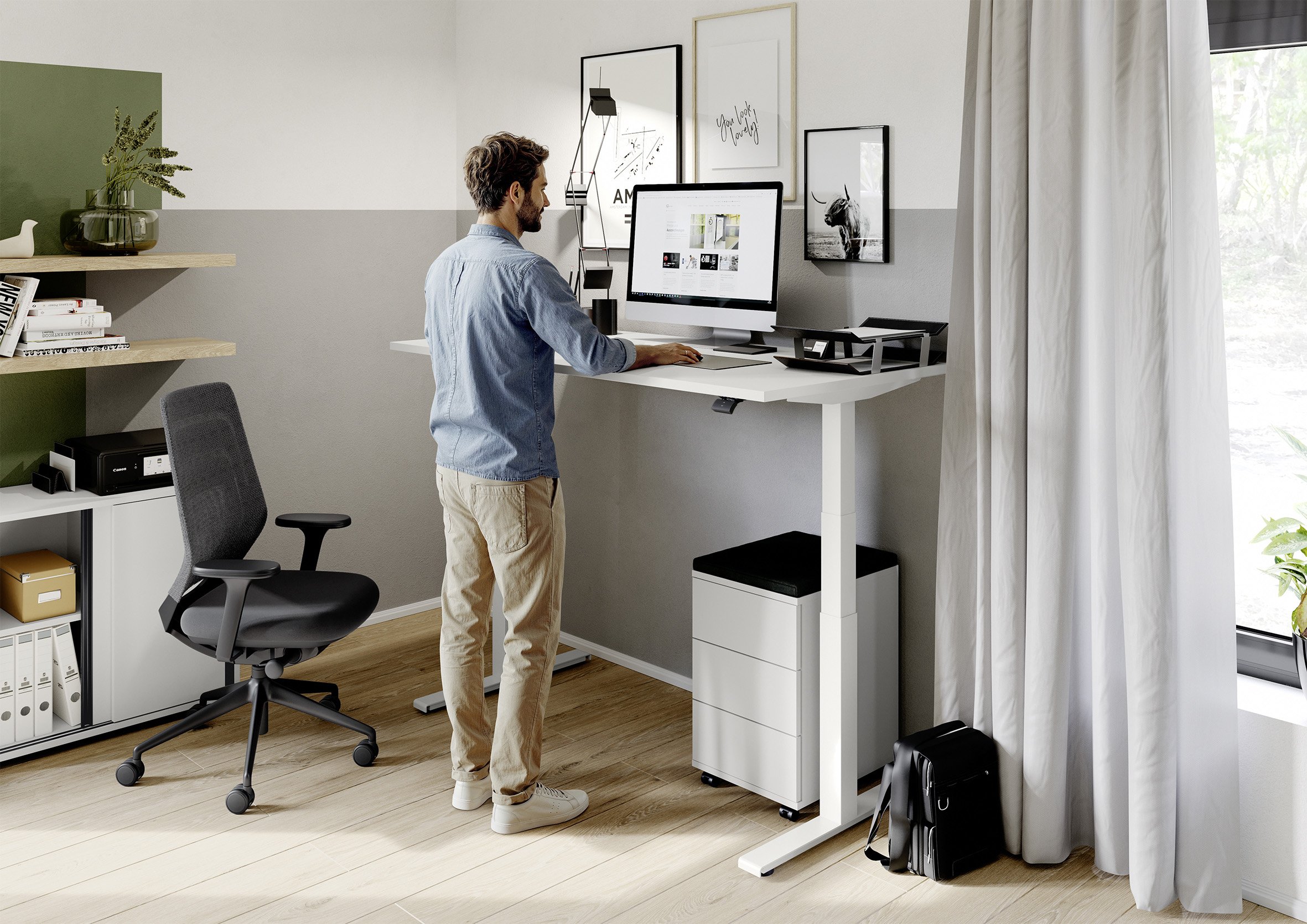Bild 3: Höhenverstellbarer Schreibtisch: Ein dynamischer Arbeitsalltag beugt nachweislich Rückenschmerzen vor. Foto: DGM/fm Büromöbel